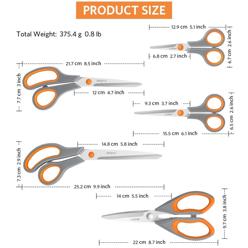- The blades thickness of the10‘’、 8‘’、 6.5‘’and the 5.5‘’ scissors are both 2mm, and the blades are finely polished and very sharp. Can easily cut paper, photo paper, cloth, thread, etc. Suitable for daily home and office.