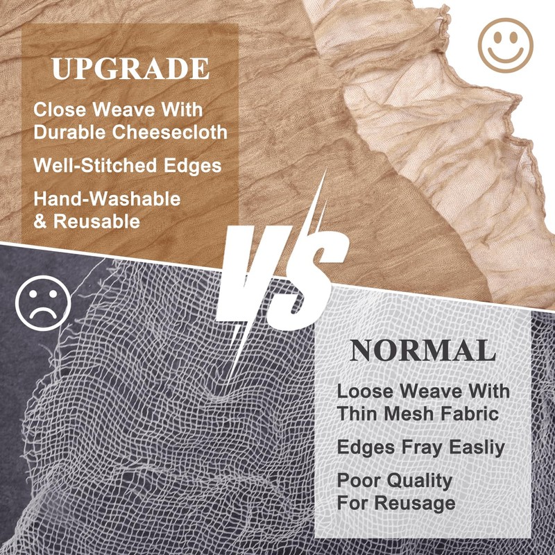 • 【Cheesecloth Table Runner】 Size: 35" W x 120" L. You will get 4 pieces 10FT length cheesecloth table runner. The sheer rustic table runner is long enough to span a large table and drape gracefully across the table. It will gently sway in the wind, adding a romantic atmosphere to your occasion. These eye-catching gauze table runners are ideal for arranging an elegant, stylish tablescape.