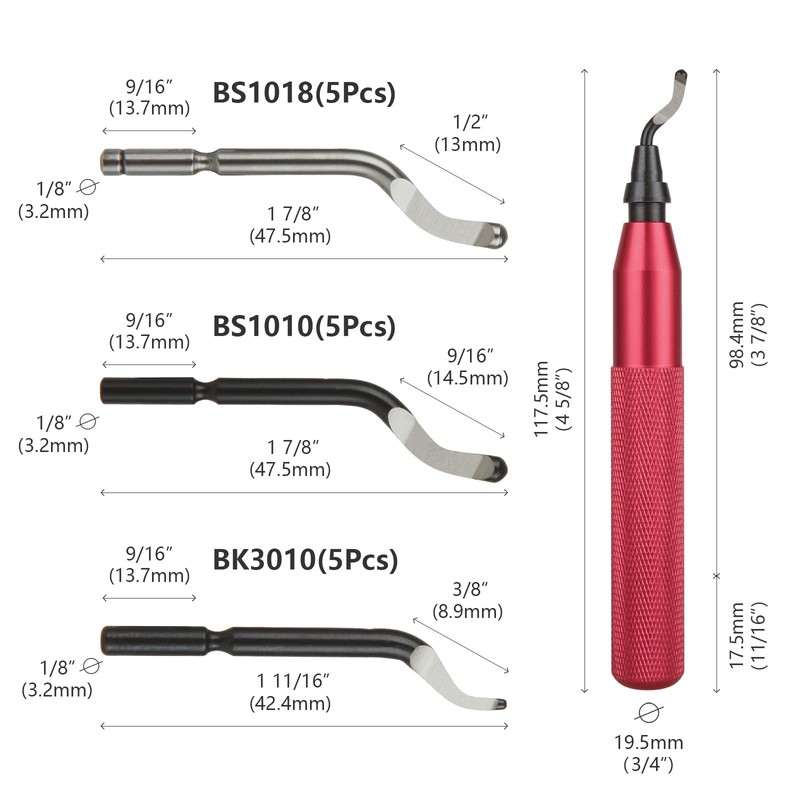 - A total of 15 heavy-duty S-blades - with 3 different blade sizes for different deburring situations. 5 BS1010 blades, 1.87 inches long, 5 BS1018 blades, 5 BS3010 hook blades for removing external and internal burrs from certain holes.