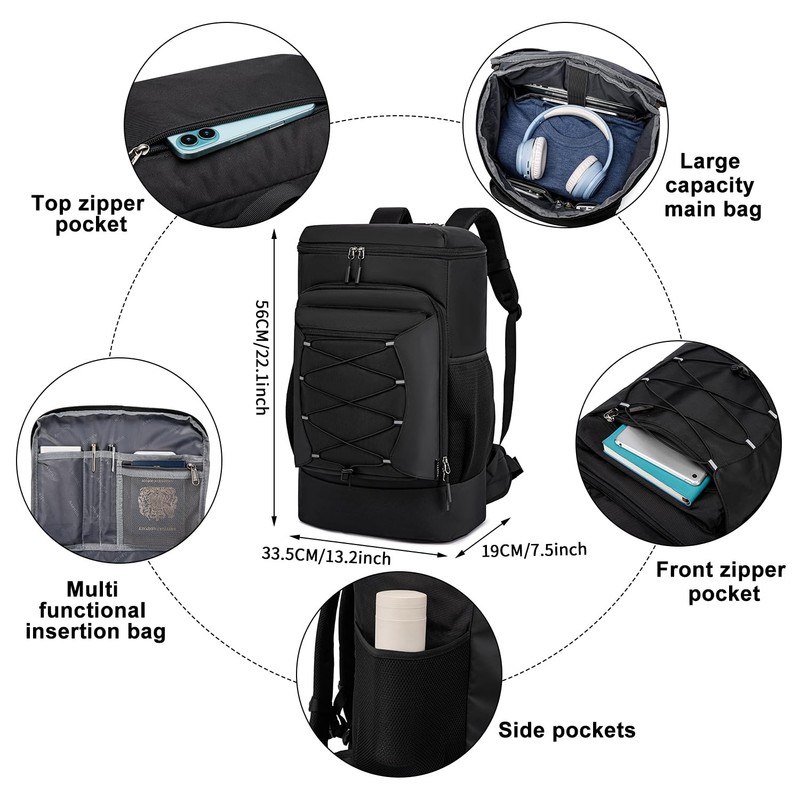 - 【Unique Front Storage Function】:This large travel backpack has a unique front storage space in addition to the built-in storage space to store your outdoor sports travel items, such as: soccer balls, basketballs, skateboards, yoga mats, outdoor rugs, your coats and jackets, and other items you can store, and the double-buckle design makes it very easy to access and store your items.