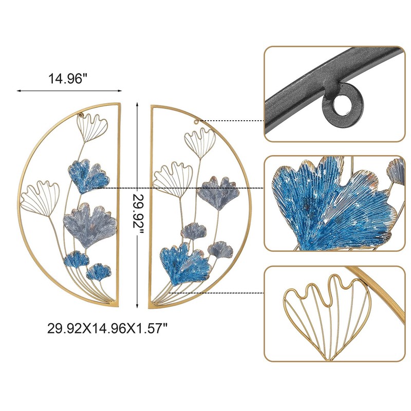 - SET OF 2 METAL WALL DECOR - 2 pieces of semi-circular metal ginkgo leaves wall art with a frame that can be combined together to form a complete circular decoration or used individually.