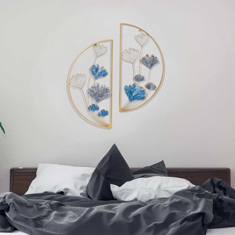 Asense Set of 2 Modern Metal Ginkgo Leaves Wall Decor, 30 Inch Home Gold Hanging Sculpture Art for Bedroom Living Room Hotel Office Home Decor(Blue)
