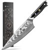 - ππ-ππ ππππππππ πππππ: Indulge in the beauty and precision of our Damascus chef knife! The exquisite 67-layer blade, forged from premium 10Cr15CoMoV steel, has a 62Β±2 HRC hardness rating for long-lasting sharpness. The V-shaped sharp edge, honed to a 10-15Β° angle on each side, effortlessly slices through meats, vegetables, and fruits.