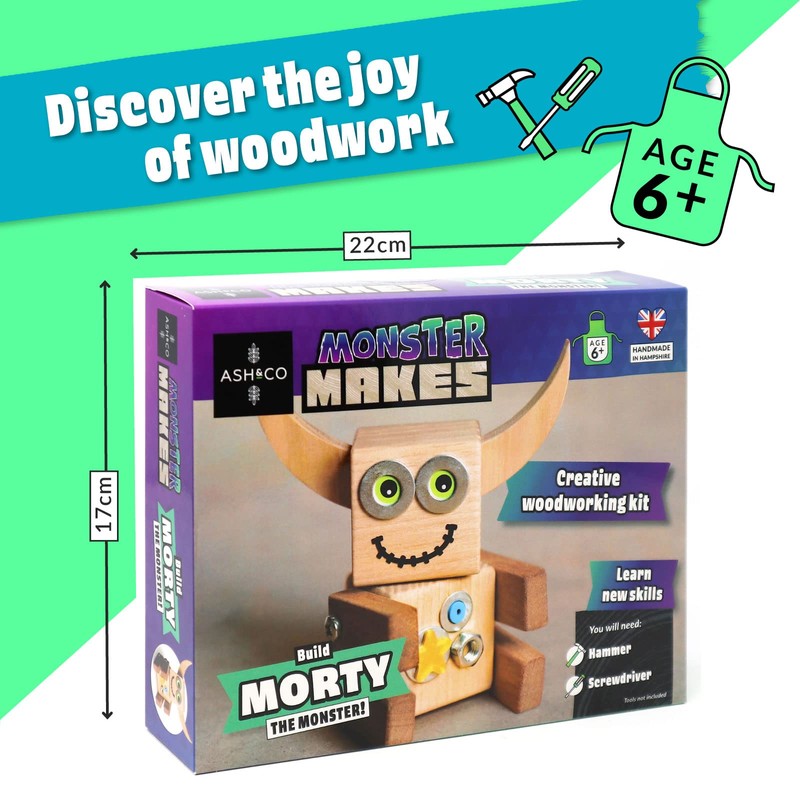 A Monster Makes mini-maker kit is the first step towards a life-long love of woodworking, giving hands-on experience of how to sand and finish wood as well as understanding basic joinery skills using dowels to attach the moveable arms and legs.