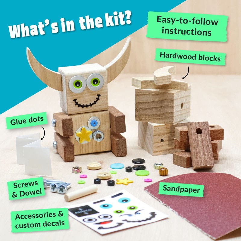 The project is great for children age 6 – 12 and comes with pre-drilled hardwood blocks and accessories to customise your character, plus instructional videos to bring the workshop experience into your home.