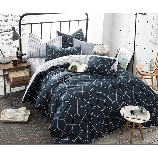 • Modern pattern, simple and stylish, navy blue, white, hexagonal geometric pattern, geometric duvet cover, reversible, side printed, with classic blue, white stripe, excellent decoration for your elegant contemporary bedroom.