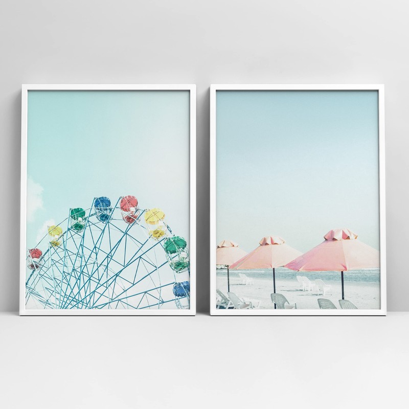 Ashbrook Framed Wall Art Collage Print Gallery Set Carnival Ferris Wheel & Beach Chairs & Umbrella Nature Wilderness Photography Modern Colorful for Living Room, Bedroom, Office - 12"x16"x2 WHITE