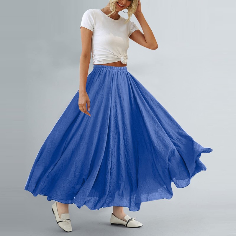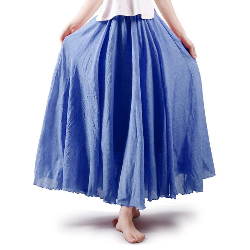 ASHER FASHION Women's Bohemian Style Elastic Waist Band Cotton Linen Long Maxi Skirt Dress (105CM, Denim Blue)