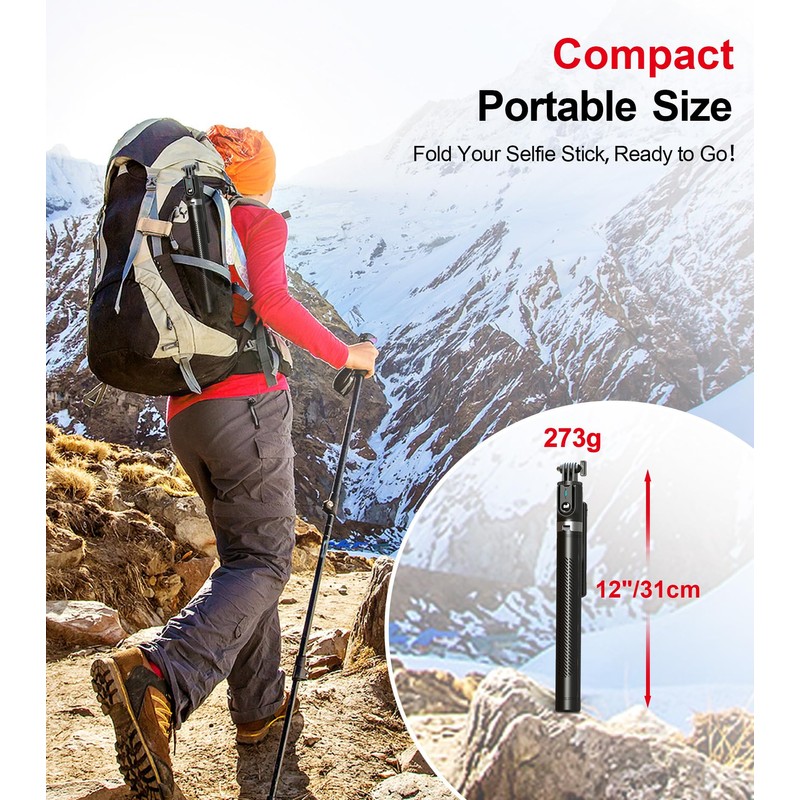 • Lightweight and Portable: The ASHINER selfie stick tripod with remote is designed with portability in mind. With a folded length of only 12 inch(31cm) and a weight of 0.6 Ib(273g), it's incredibly lightweight and easy to carry around. You can easily pack it in your backpack and take it with you wherever you go, making it the perfect travel companion. Its compact size also makes it ideal for outdoor activities such as hiking, camping, or cycling, as it won't weigh you down.