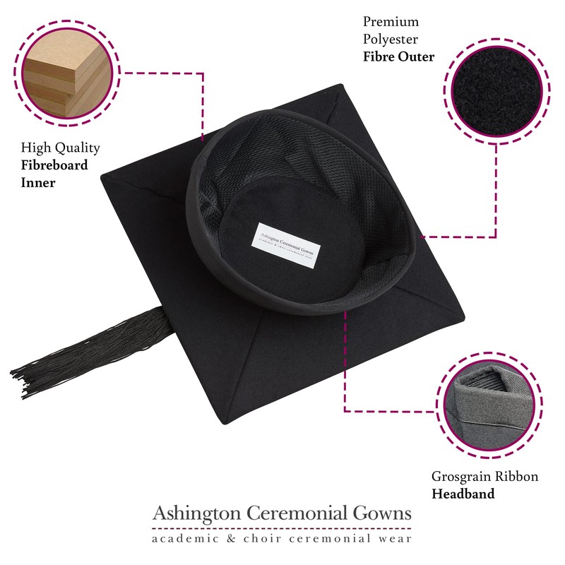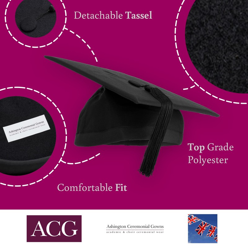 - ICONIC BLACK ACADEMIC COLLEGE GRADUATION CAP WITH UK STYLE TASSEL; SUITABLE FOR BA AND MA CEREMONIES - Ashington Gowns graduation apparel brings you this iconic black graduation cap and tassel in 100% polyester. This cost effective black graduation cap is designed to suit all types of academic ceremony including Bachelors (BA) and Masters (MA) qualifications. Fitted with UK style tassel - non-platted, with single colours.
