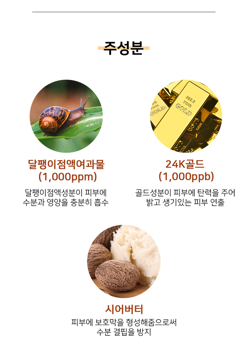 - Feature: Snail Mucin Filtrate (1,000ppm), Adenosine, Niacinamide, Alpha-Isomethyl Ionone Gold (1,000ppb)