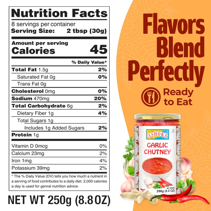 Ashoka Hot Garlic Chutney | Made with Garlic, Red Chilies & Lime | Vegan | Kosher | Original Indian Cuisine Since 1932 | Spicy Garlic Chutney | Great for BBQs, Wings, and Salads | 250 Grams