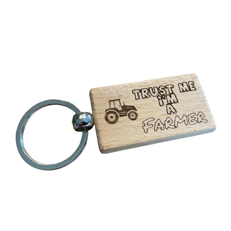 - Farmer Keyring: Features the proud and humorous phrase “Trust Me, I’m a Farmer” alongside an engraved tractor image, perfect for those in agriculture.