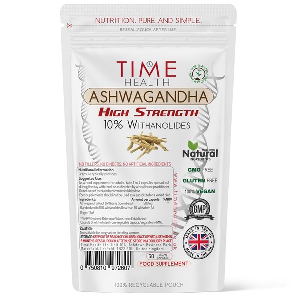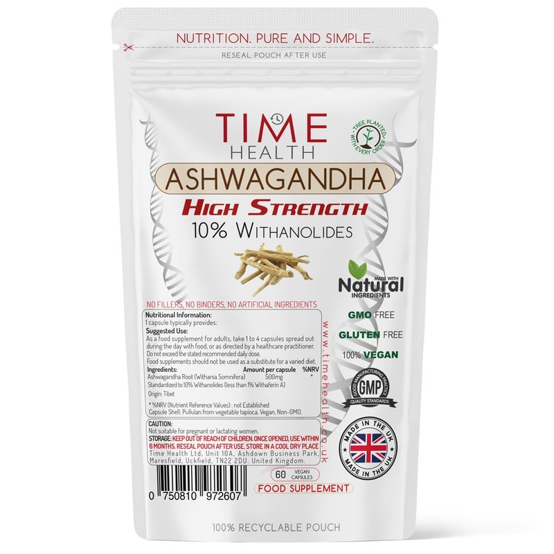 - ✔️HIGH WITHANOLIDES. Time Health Ashwagandha is tested at 10% Withanolides (HPLC measured) and contain less than 1% Withaferin A. Inferior brands use an extract % as a way to hide the fact that their product has low Withanolides, even if the product has an incredibly high extract % without Withanolides you're not getting the full potential of this amazing product. Always ask these levels before you make any purchase of Ashwagandha.