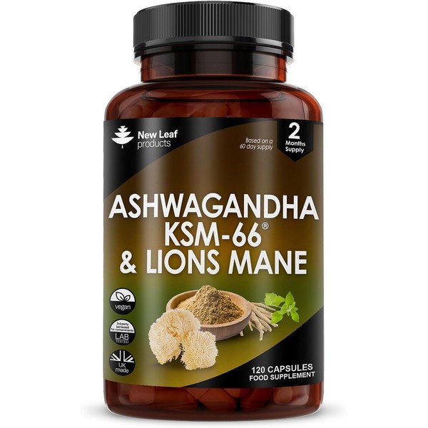 Ashwagandha KSM-66 and Lions Mane Capsules - High Strength 2000mg KSM-66 Ashwaghandha Root Extract and Lions Mane Mushroom Extract - 120 Vegan Capsules with Black Pepper - UK Made by New Leaf