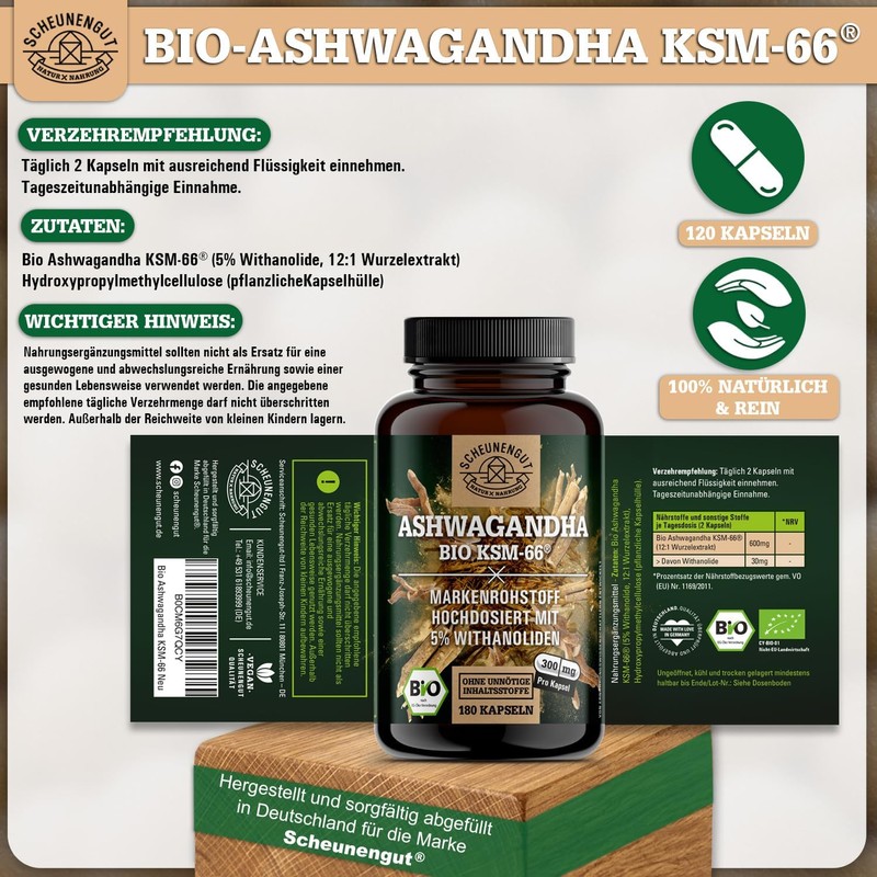 - Organic Ashwagandha KSM-66 - We at Scheunengut attach particular importance to the origin of the raw materials. Therefore, we use the premium brand raw material KSM-66 in organic quality. Only the roots of the evergreen ashwagandha (sleeping berry) shrub are used.