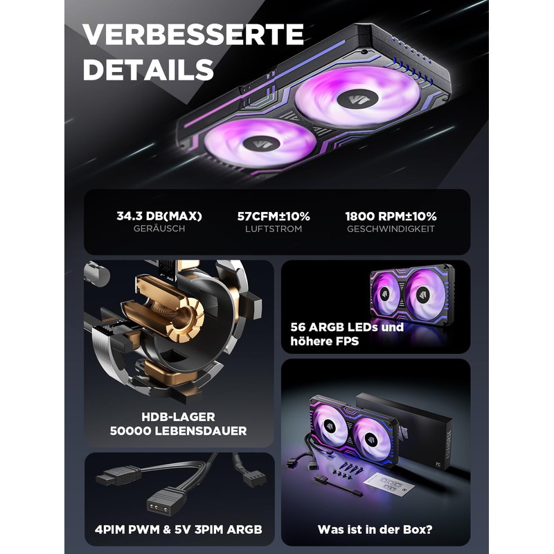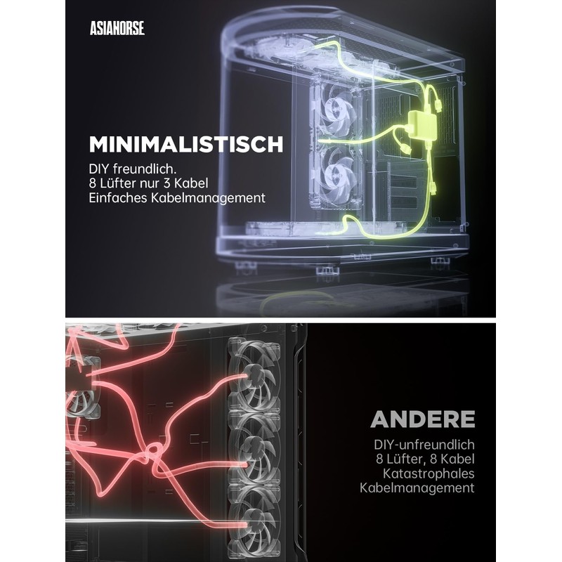 - ??ARGB-Beleuchtung?? Der 2*120mm ARGB L??fter von Asiahorse verf??gt ??ber 56 individuell gesteuerte adressierbare ARGB-LEDs. Eine Vielzahl von Lichteffekten kann ??ber das Mainboard in voller Farbe angepasst werden, synchronisiert mit dem Mainboard, um Ihren ?sthetischen Anforderungen gerecht zu werden. Der PC L??fter mit ARGB sind mit den meisten Mainboards Aura Mystic Light und Polychome Sync mit adressierbarer RGB-F?higkeit kompatibel.