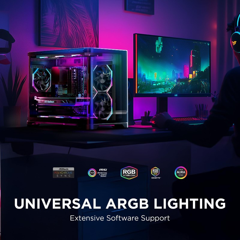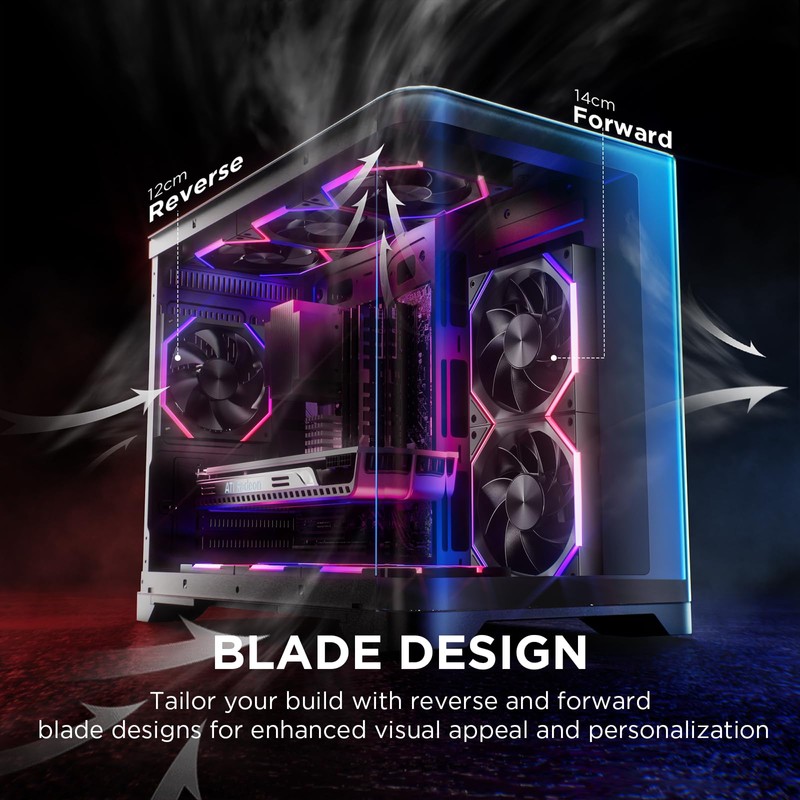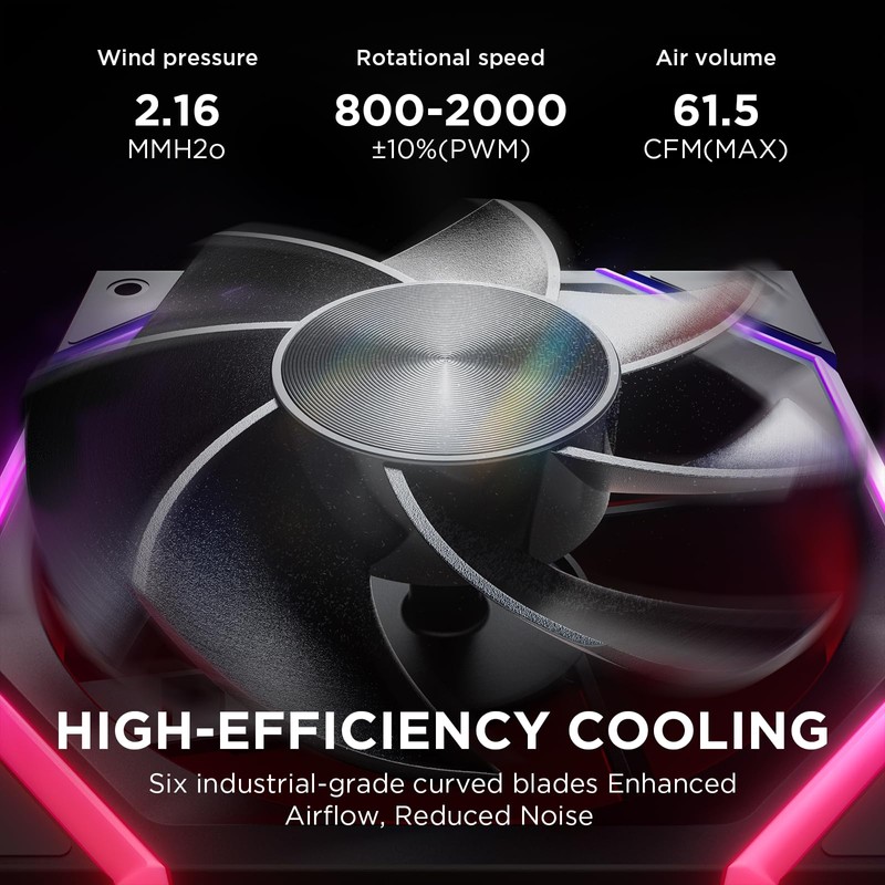 - **Efficient Cooling Power**:Our ARGB case fans deliver exceptional cooling performance, ensuring your system stays cool and stable. With a high airflow of up to 89.77 CFM for the 140mm model and 61.5 CFM for the 120mm model; and a adjustable speed of 800-2000 RPM (PWM), these fans quickly expel hot air, keeping your PC at optimal temperatures. Whether you're gaming or running intensive applications, our fans provide the cooling power you need to maintain peak performance.