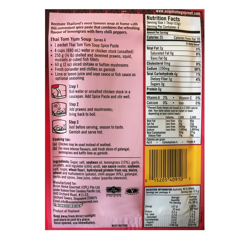 Spice Paste for Thai Tom Yum Soup 1.75g x 3. Recreate Thailand most famous soup at home with this convenient Spice Paste that combines the refreshing flavor of lemongrass with fiery chili pepper. No added MSG, Preservatives or Artificial Color. Easy to prepare. Just add this paste in a chicken stock, add seafood or chicken, shitake or button mushroom, fresh coriander and chillies as garnish and optional seasoning like lime or lemon and soy sauce or fish sauce. Serve it hot to make it even perfect for cold weather .