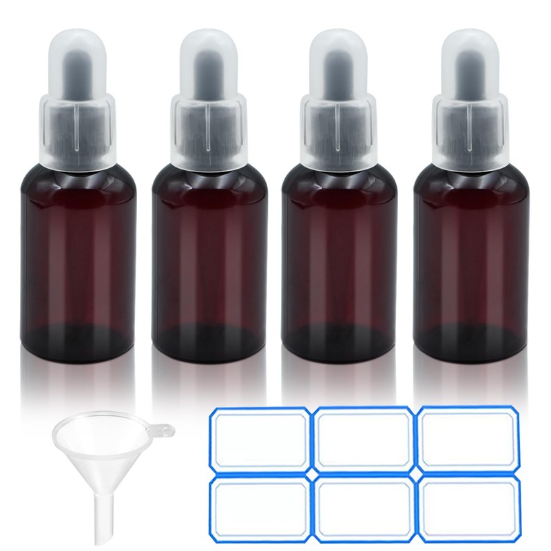 AskBed 4 Pack 2 Oz (50ml) Amber Plastic Essential Dropper Bottles with Funnel, Labels for Liquid Storage