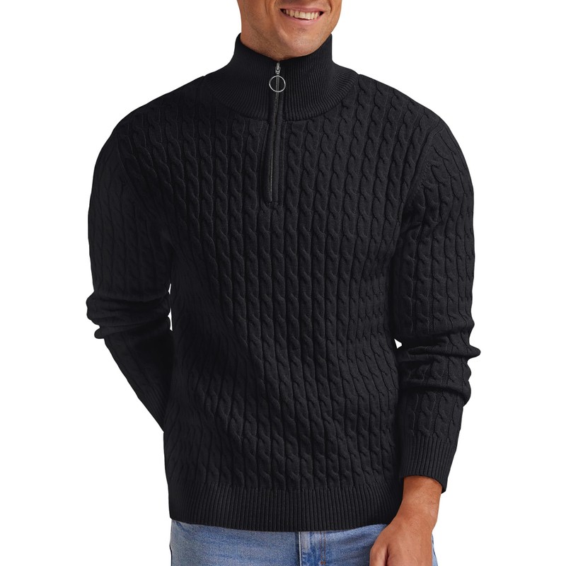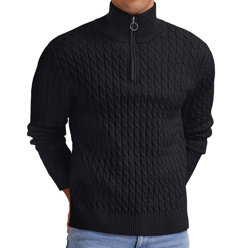 - FEATURES - Askdeer men's pullover sweaters with Refined cable knit texture/Soft elastic mock neck/Soft knitted fabric/Ribbed cuffs and hem/Timeless zip design/Long sleeve. Refined cable knit pattern adds amazing texture, soft and stretch fabric makes this polo sweater cozy and easy to fit through the shoulders, chest, and waist.