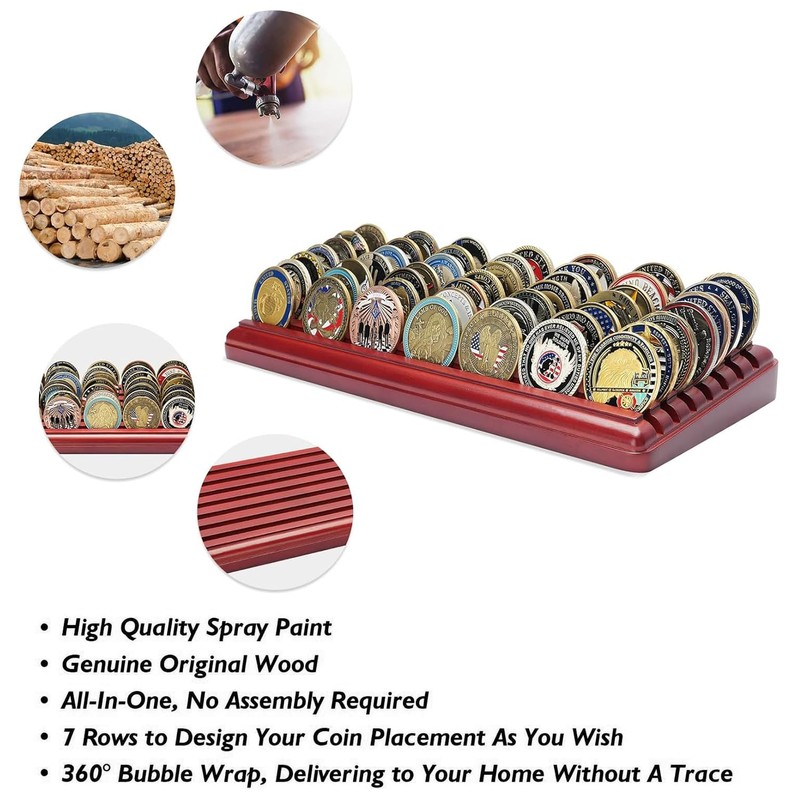 - SOLID WOOD: Challenge coin display stand is made of new zealand pine wood and covered with Fade-resistant varnish finish. Please note! natural solid wood has a very beautiful, unique structure, Strong and reliable,therefore, the color of the challenge coin holder display you bought may be slightly different from the samples on the photo.