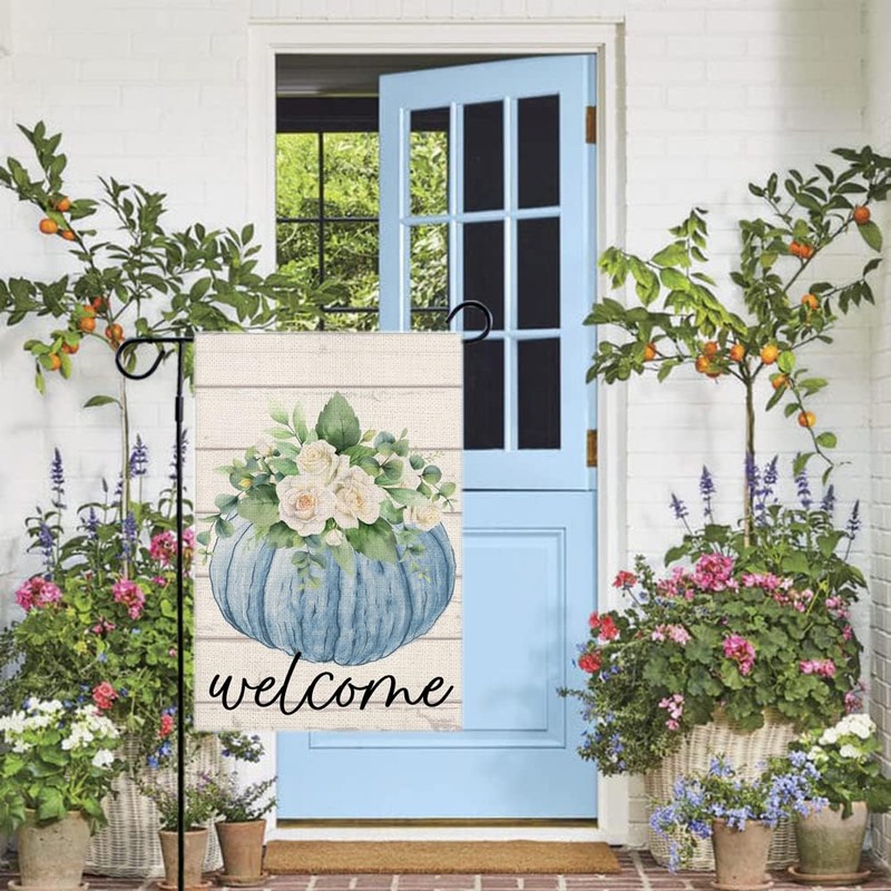 Asminifor Fall Pumpkin Welcome Garden Flag 28x40Inch Double Sided, Seasonal Autumn Harvest Thanksgiving Stripe Rustic Farmhouse Magnolia Floral Yard Outdoor Decoration Burlap Yard Flag