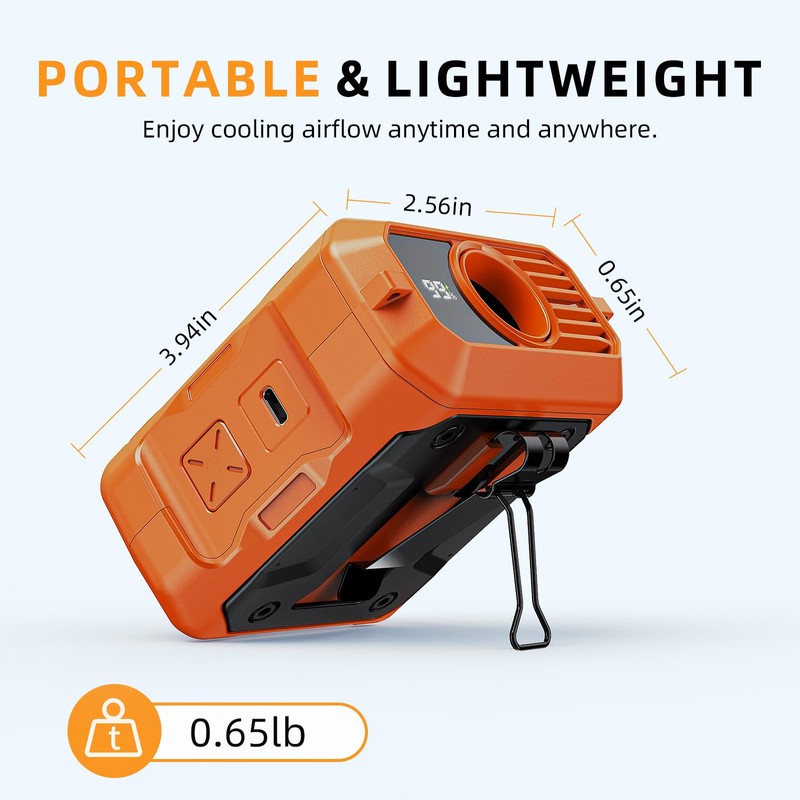 - [Portable & Durable] Our clip on fan designed to weigh only 0.65 pounds. Equipped with a lanyard and metal clip, it can be used as a handheld, clip-on, neck, or desk fan. Ideal for hiking, jogging, or on a hot jobsite. The light weight and variety of uses make your life more colorful.