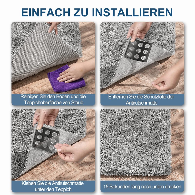 - Easy installation: remove the adhesive film and stick the carpet to the bottom of the carpet you want to secure. Then remove the film covering the silicone surface and press the carpet firmly on the floor. Note: the raised side is the ground contact surface.