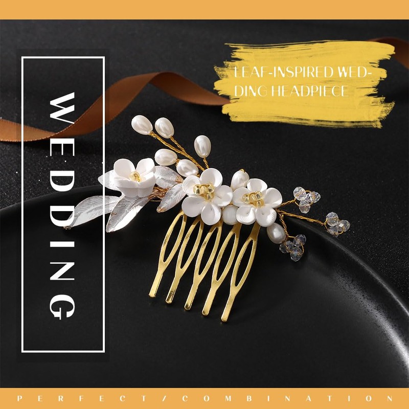 - Flower wedding hair comb is made of alloy and pearls, decorated with gorgeous white flowers and gold leaves.