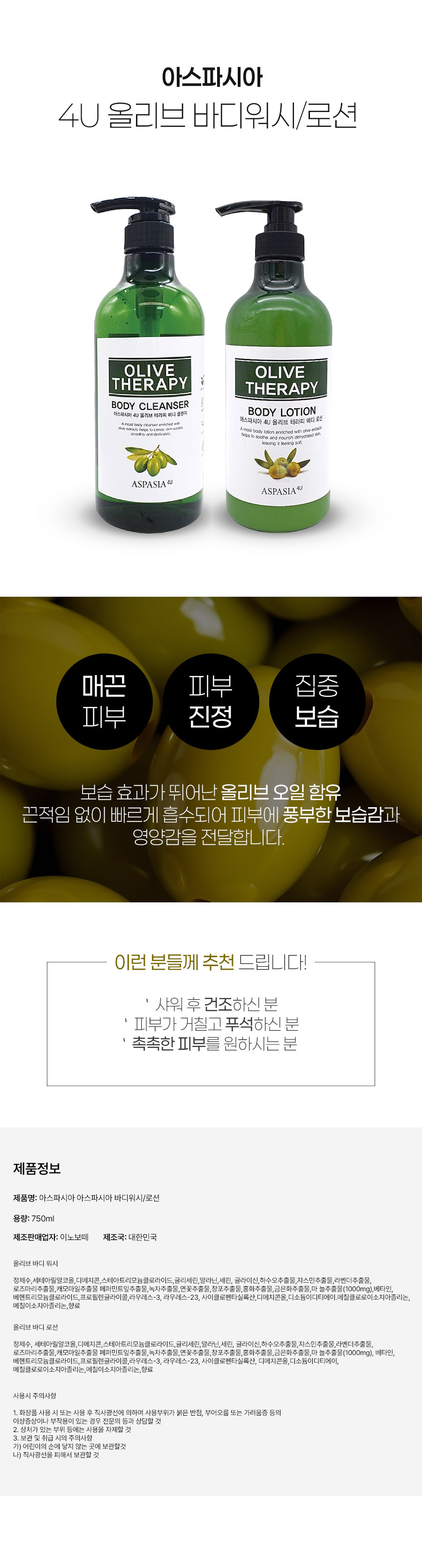아스파시아 4U 올리브 테라피 바디 로션 750ml