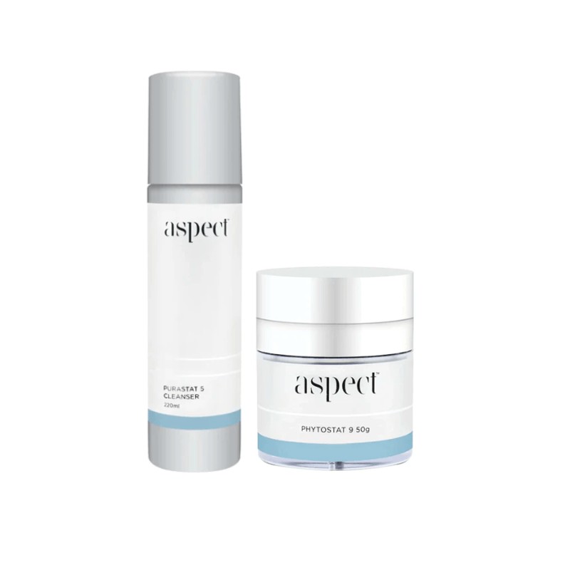 This bundle contains Aspect Purastat 5 Cleanser 220ml and Aspect Phytostat 9 Moisturiser 50g, perfect for those looking for a gentle yet effective skincare routine.