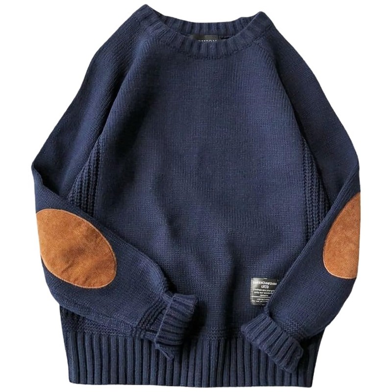 Aspersio Men's Elbow Patch, Loose Knit, Round Neck, Sweater, Long Sleeve, Top, iron blue, XL