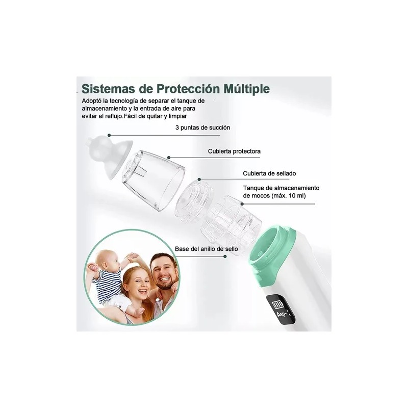 Saca Mocos Gran aspirador nasal para eliminar la secreción nasal y las vías respiratorias. La boquilla del aspirador nasal para bebés está hecha de silicona de grado alimenticio. Libre de BPA y látex. El cuerpo está hecho de material ABS, todos los materiales no son tóxicos e inofensivos para los bebés.