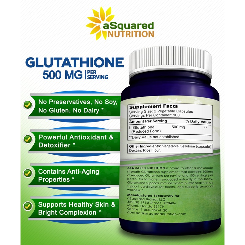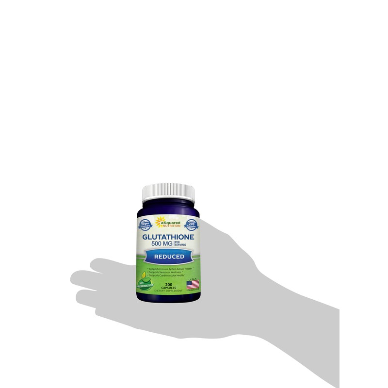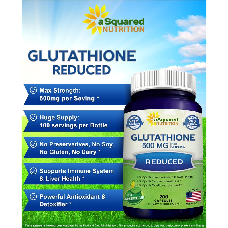 aSquared Nutrition Reduced Glutathione 500mg Per Serving Supplement -200 Capsules -L-Glutathione Antioxidant to Support Liver Health & Detox - Max Strength Powder Pills to Help Immune & Brain Function