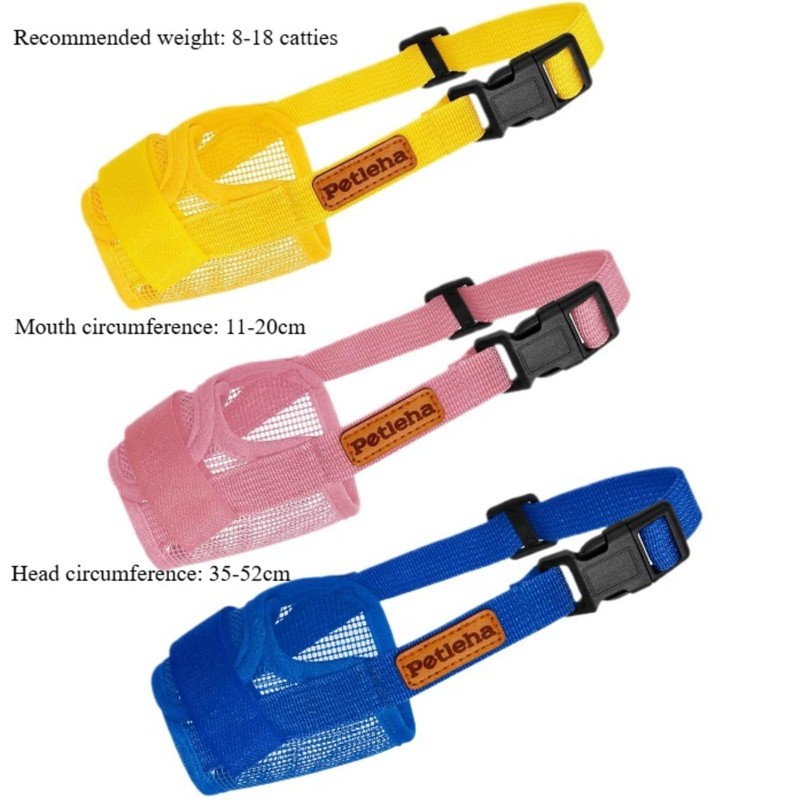 - Pet muzzle: Available in pink, yellow, and royal blue. Size M. Be sure to pay attention to the size to ensure a pleasant shopping experience. Lightweight and portable, it's easy to pack and folds up easily to fit in your pocket.