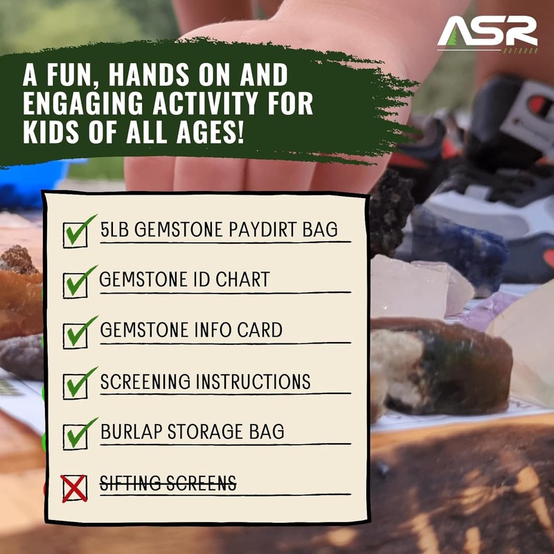 - 5LB GEMSTONE PAYDIRT KIT - This ASR Outdoor Gemstone Mining Kit comes with essential items to enjoy the thrill of sifting through paydirt and identifying precious minerals: a 5 pound bag of assorted rough gemstone paydirt (Brazilian), a gemstone identification chart and a plastic sieve