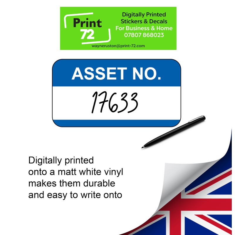 Quality control labels: Asset number - 250 stickers, 38 mm x 22 mm. Digitally printed on a matt white vinyl, makes the stickers easy to write onto and durable. A cost effective to to asset manage