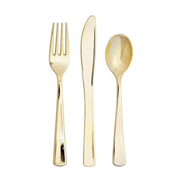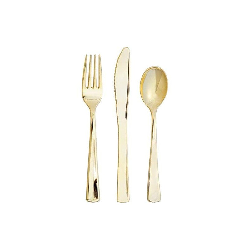 - Package includes 24 pcs. Assorted Metallic Gold Boxed Plastic Cutlery Set which contains 8 pcs. knives, 8 pcs. forks, and 8 pcs. spoons