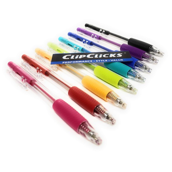 8 Retractable Colored Ink Ball Point Pens - 8 different colors: Pink, Red Yellow, Green Teal, Blue, Purple, & Black. Comfort Grip Style Pen - 1.0 mm. Easily Clips Onto Pockets or Other Items. Long Lasting Ink Supply with Super Smooth Writing, Standard Use. 8 Different Colored Pens Per Package, 1.0 mm Line Size
