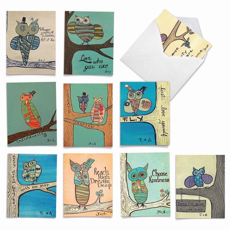 Assortment of Blank All-Occasion Note Cards (4'' x 5 ¼'') with White Envelopes - ?Life?s a Hoot? Greeting Cards Featuring Childlike Owl Drawings and Inspirational Quotes M6630OCB