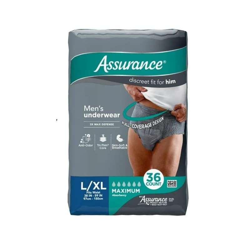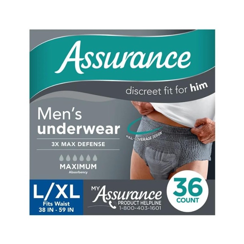 - Assurance Men's Incontinence Underwear- Discreet fit for him Our smooth-stretch fit provides a full coverage design made for your body shape and comfort Maximum absorbency Fresh new look and improved design.