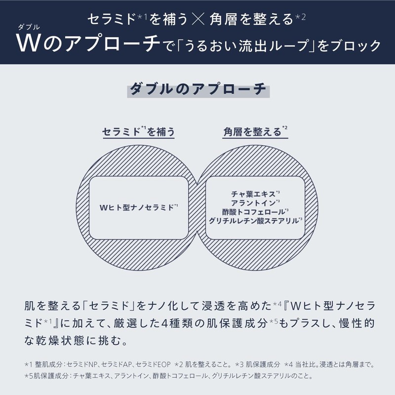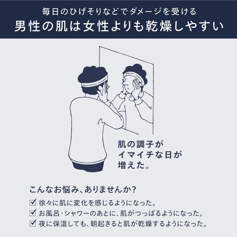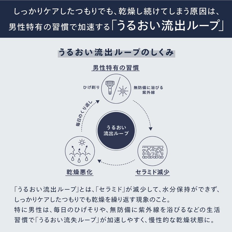 - Focuses on the causes of dryness unique to men: This product focuses on the "moisture spill loop" which accelerates by man's specific habits such as beard shaving. Adopts a double approach that compensates for ceramide (*1) x adjust the square layer. Moisturizes the skin and provides healthy and comfortable skin. (*1) Skin shaping ingredients: Human type ceramide (ceramide NP, ceramide AP), humanoid acyl ceramide (ceramide EOP). (*2) "adjusting the corners" means shaping your skin