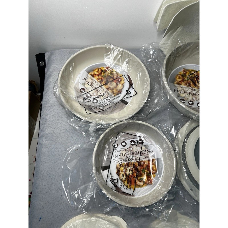Cream white ceramic cookware with a sleek non-stick finish. Includes detachable handles for space-saving storage — perfect for RVs, campers, or tight kitchen setups. Oven safe and induction compatible.