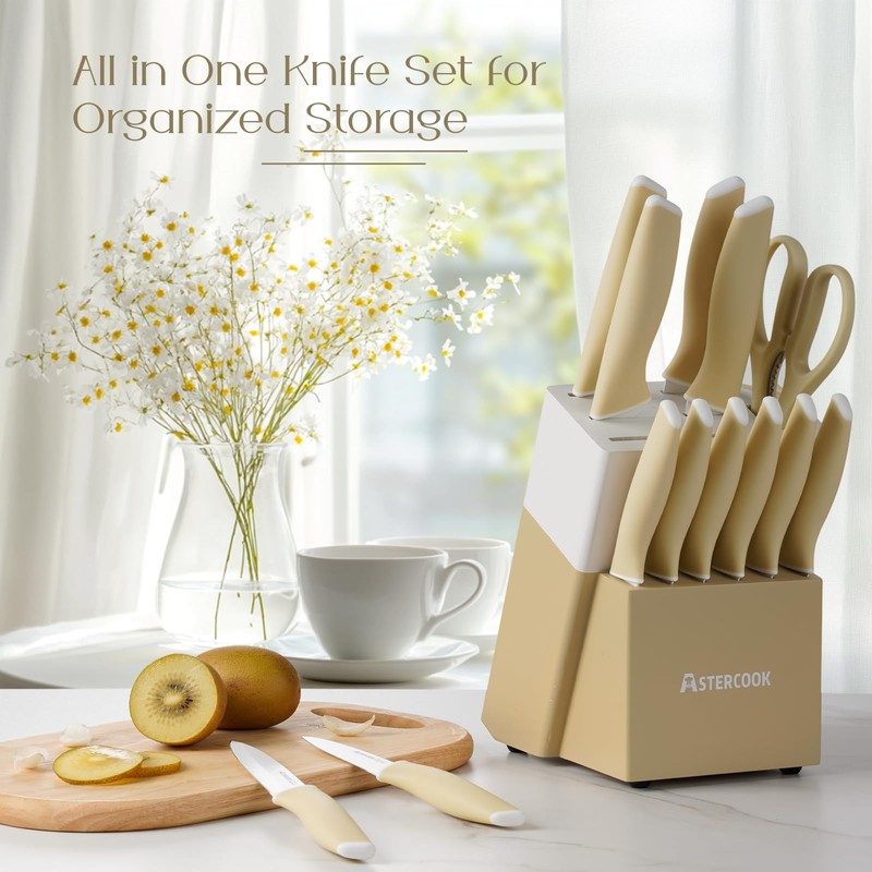 Astercook Knife Set Block and Sharpener 15 Pcs German Stainless Steel Knives Yellow