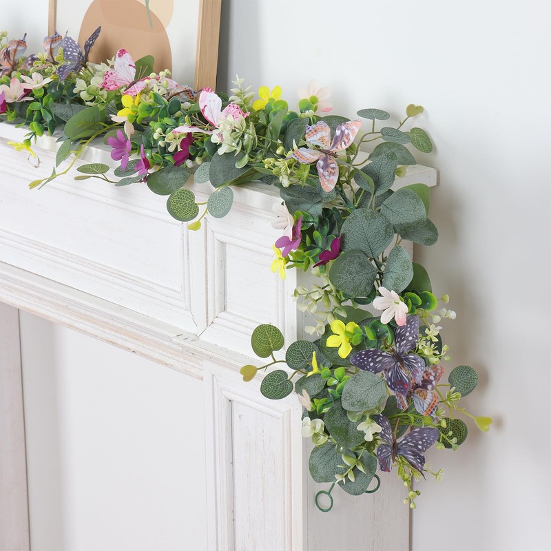 - Artificial flower garland: This package comes with 2 pieces handmade wine garland. Each eucalyptus flower garland is about 5.68 feet long. These green garlands are decorated with handmade 3D art deco butterflies and colourful flowers that look more realistic and attractive, add vitality and colour to your room and are full of fun