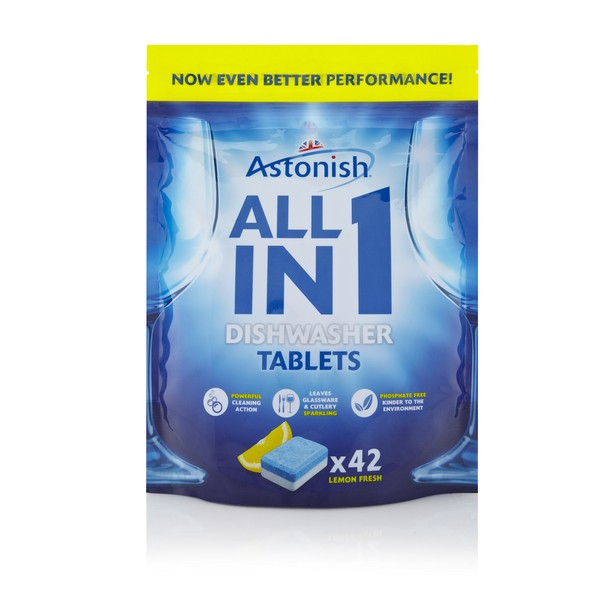 - One pack of 42 Astonish Dishwasher Tablets. Formulated with a powerful cleaning action to remove even the toughest stains including tea, coffee, dried sauces and gravy.