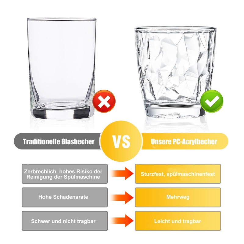 - HIGH QUALITY Made of heat-resistant, impact-resistant and wear-resistant acrylic, each unbreakable drinking glass offers a maximum capacity of 300ml and is BPA free. The robust cup body ensures stability and safety for versatile consumer groups.