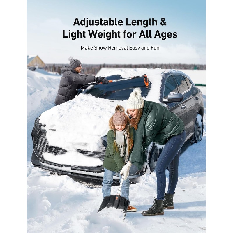 - Adjustable Length: The adjustable-length design, (snow brush from 36.4" to 47.2" snow shovel from 33.6" to 44.5"), provides easy adjustment for users of all ages and heights. Adjust the length as you wish, ensuring every use is comfortable and easy to grip. Even kids can easily use these tools(with parental supervision).