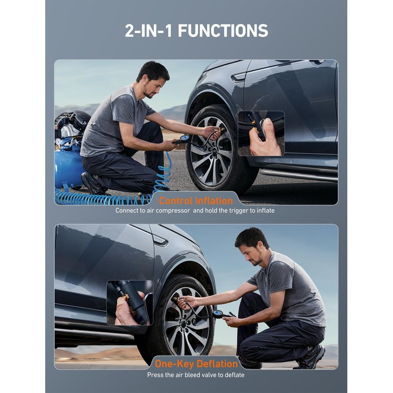 - ALL-IN-ONE FEATURES: The LED backlit screen features measurements in PSI, KPA, Bar, and Kg/cm^2; Includes an inflator, straight locking chuck, gauge, hose, bleed valve, all in one unit, ideal for cars, bicycles, motorcycles, balloons, air cushion, sports balls and so on; Compatible with ¼” NPT air compressors output and ¼" NPT Quick- Connect Fitting.